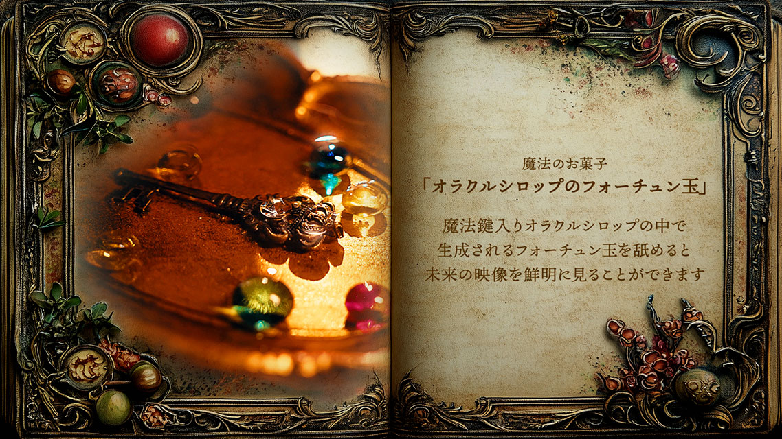 ☞ 魔法のお菓子 「オラクルシロップのフォーチュン玉」 魔法鍵入りオラクルシロップの中で生成されるフォーチュン玉を舐めると、未来の映像を鮮明に見ることができます。